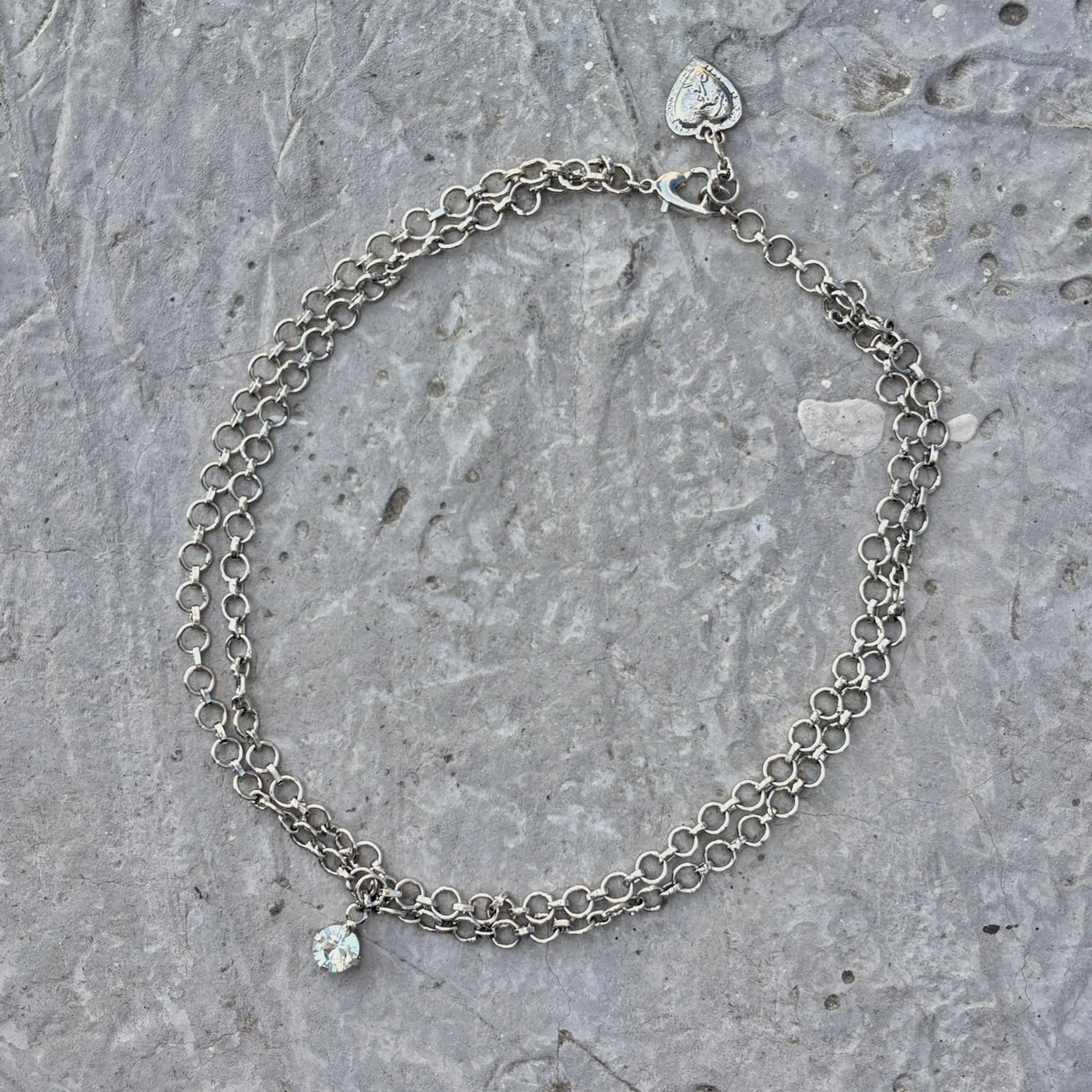 A minimal silver-toned double chain necklace featuring a subtle round crystal charm at the centre. Designed to sit neatly along the collarbone, this piece adds just the right amount of shine without overpowering your look.