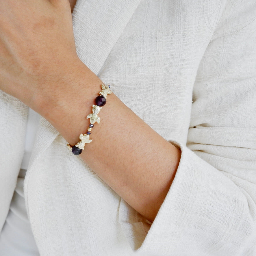 A nine-fish bracelet produces a sense of crafted wonder with 9 koyals. Her golden tones and organic form capture the light and reflect it with a splendor that draws attention. It has a heart shaped mother of pearl