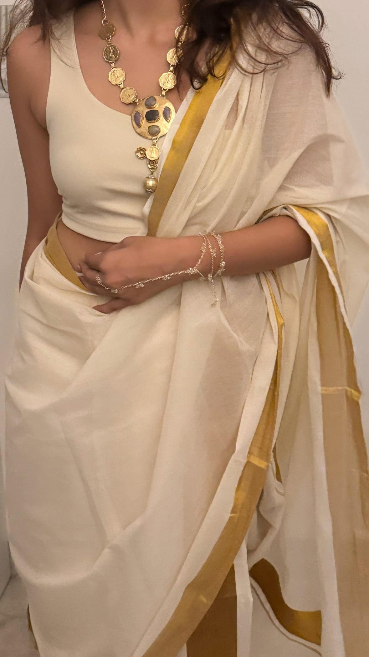 It draws inspiration from dew drops on leaf on an early morning. Thiw hand chain elegantly drapes from finger to wrist, adding a touch of ethereal beauty to any outfit.