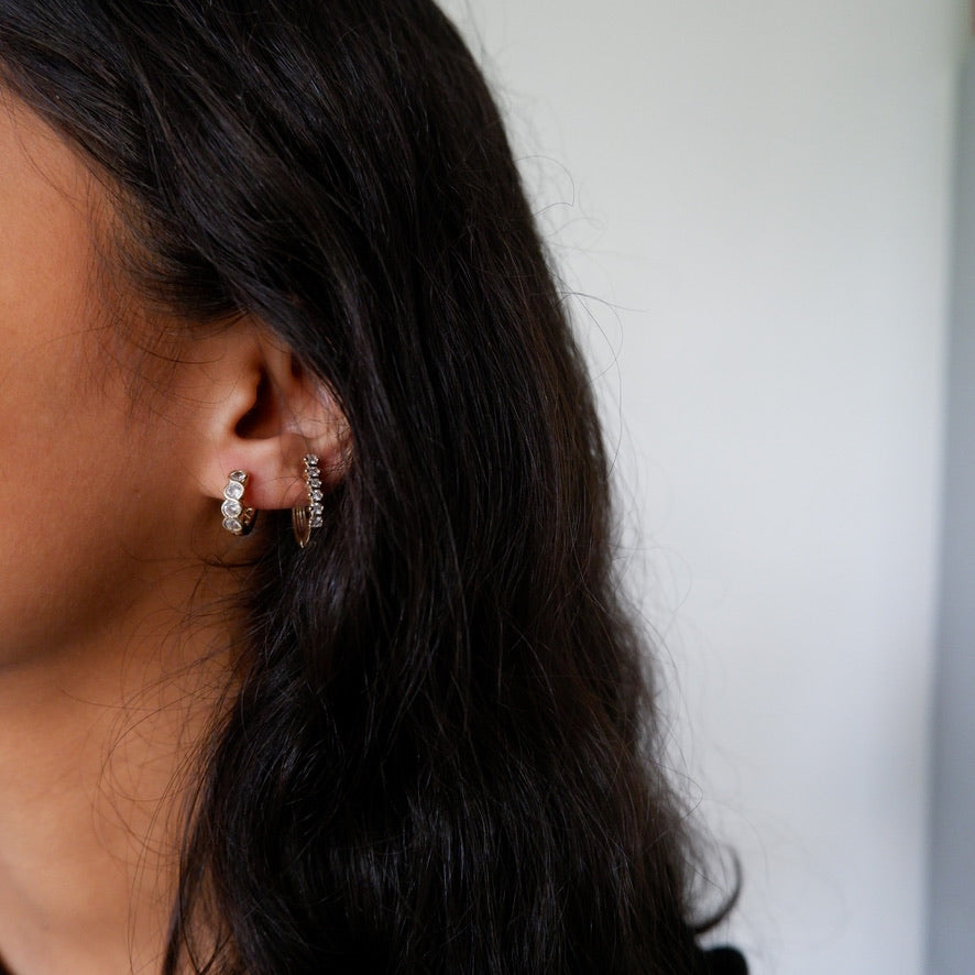 Two signature huggie hoops, one with classic prong-set zircons, the other in sleek bezel-set sparkle.