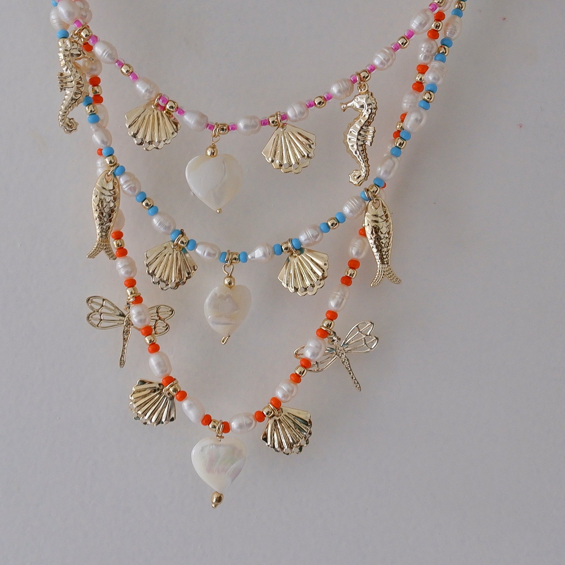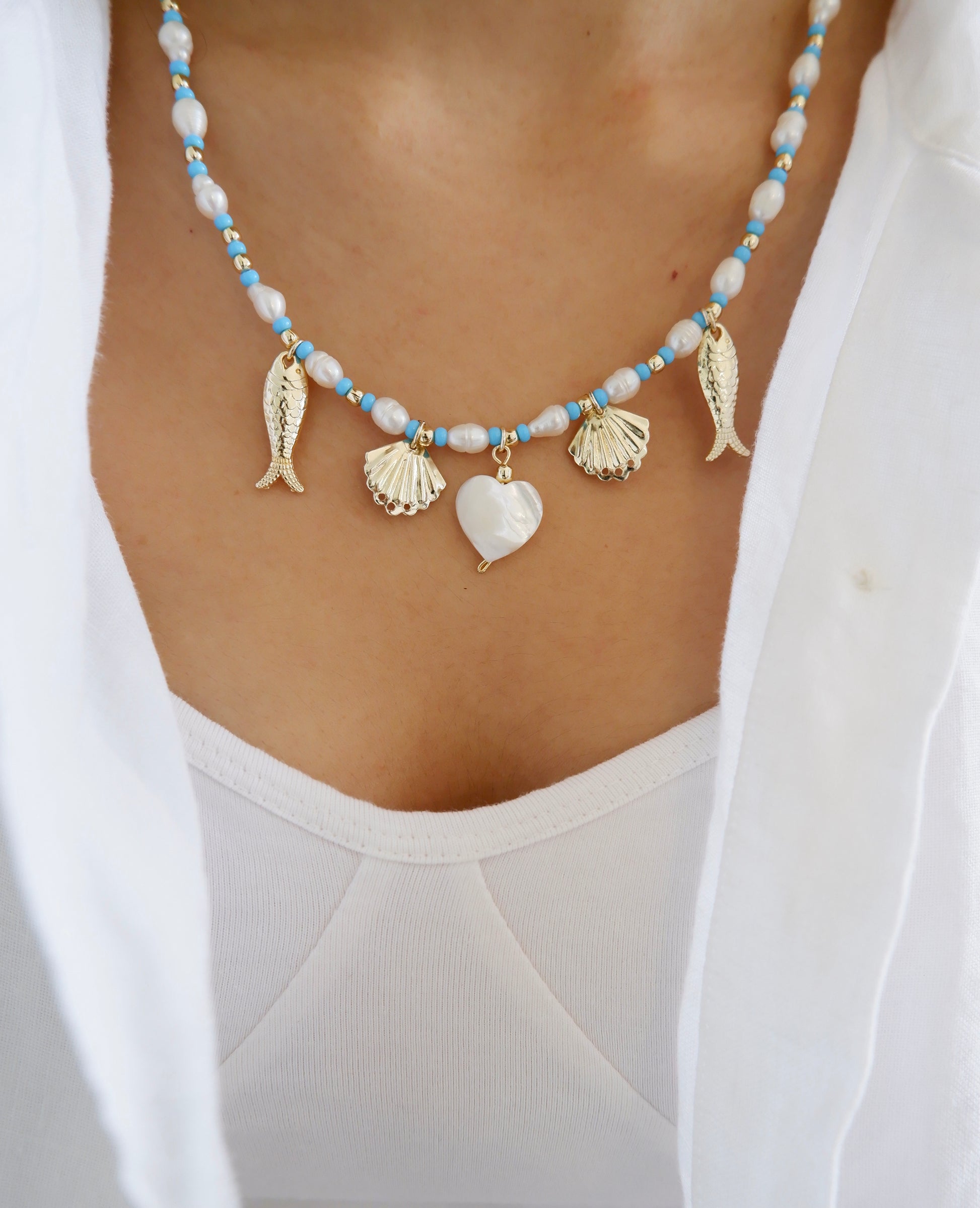 The vibrant mix of blue accents with golden and pearly elements evokes the feeling of a day spent by the beach. Perfect for summer outings or to bring a nautical touch to any look, this necklace adds a playful and elegant flair, making it ideal for lovers of the ocean and coastal vibes.