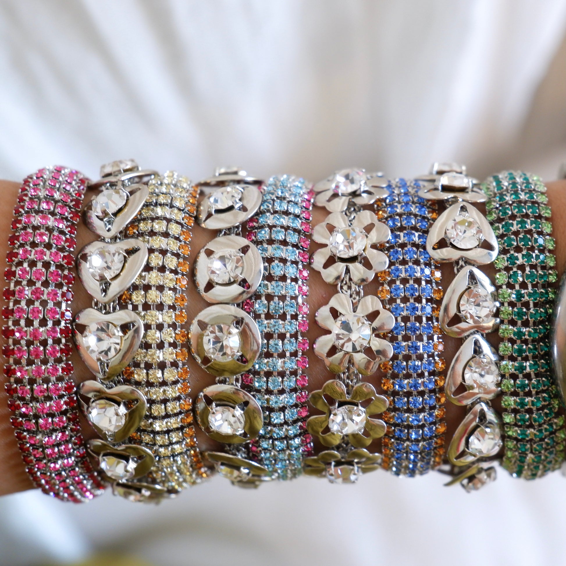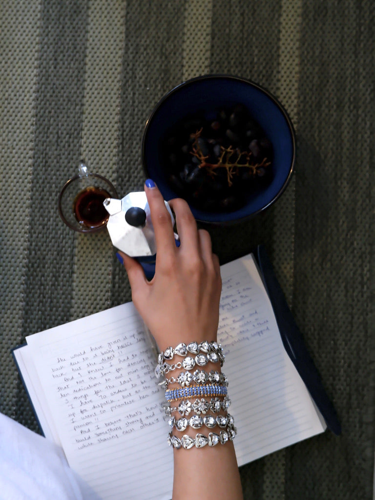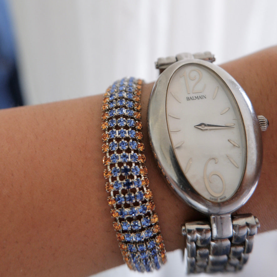 A structured bracelet featuring woven blue crystals set in a brown-tone frame. Lightweight, flexible, and easy to style for any occasion. It comes in 4+ colors, so you can mix, match, and style it your way.