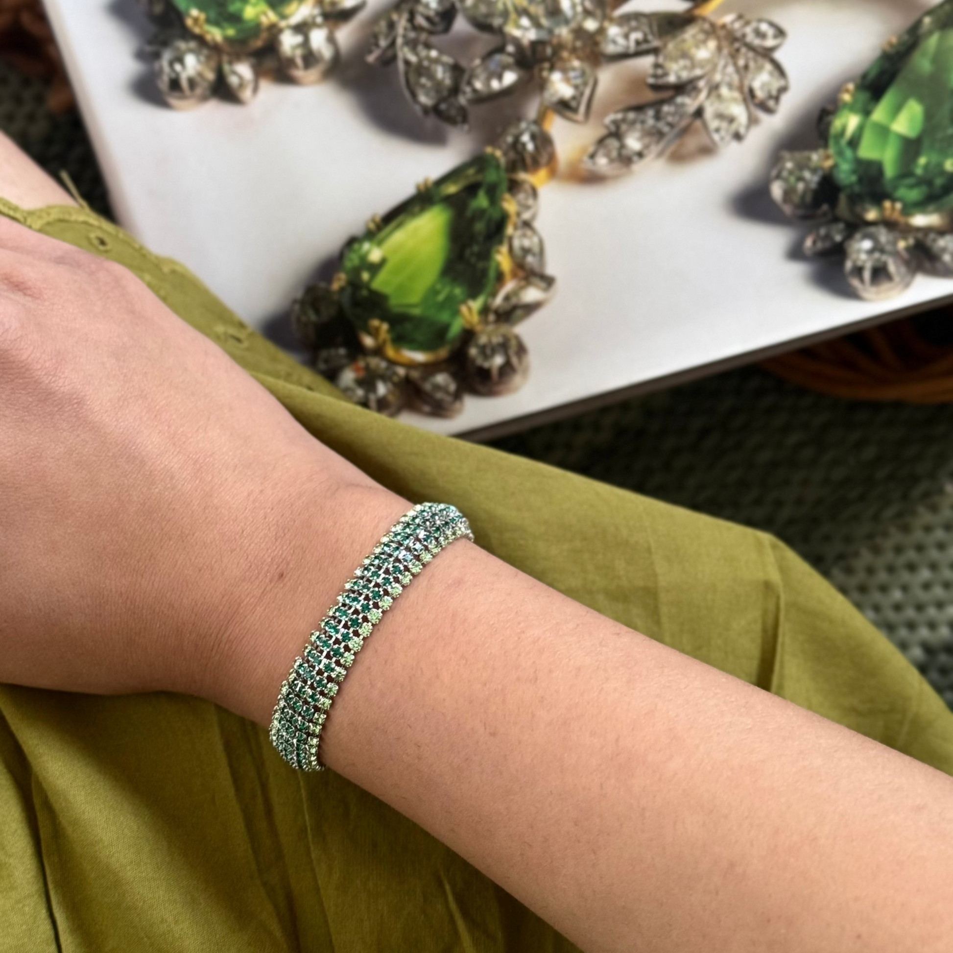 Inspired by the shimmer of emerald evenings and old-world glamour, the Emerald Moonbeam is your perfect arm candy for both candlelit dinners and festive soirees. Hand-set with lush green and icy white crystals, this statement piece sparkles with every flick of the wrist.
