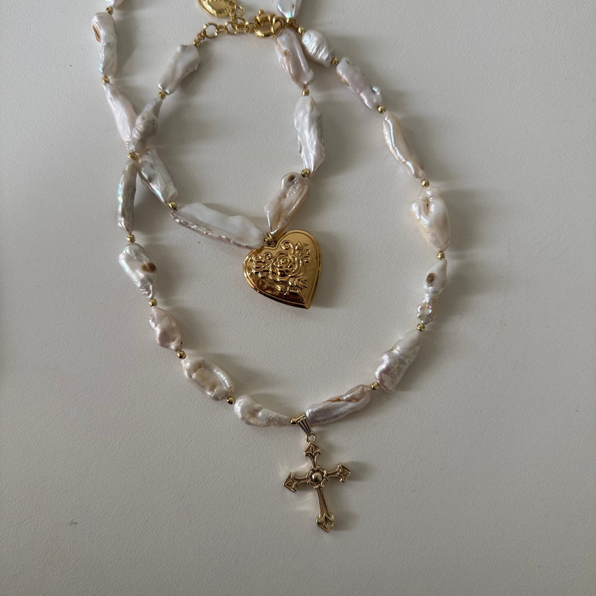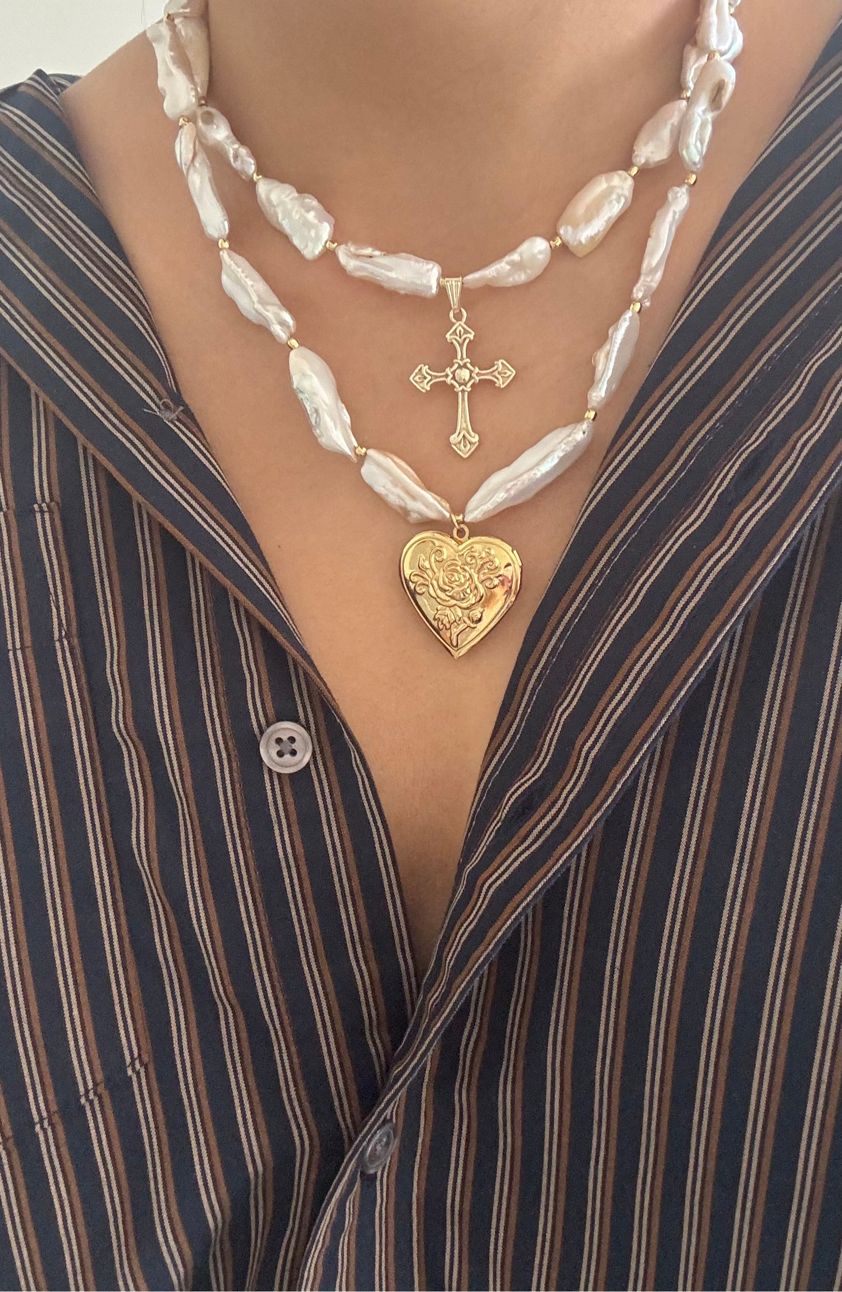 An ode to timeless romance, this statement necklace pairs the organic beauty of chunky baroque pearls with a vintage-inspired golden heart locket. Intricately engraved with a blooming rose, the heart charm adds a touch of old-world elegance. Each pearl is uniquely shaped, making every piece one of a kind — just like your story.
