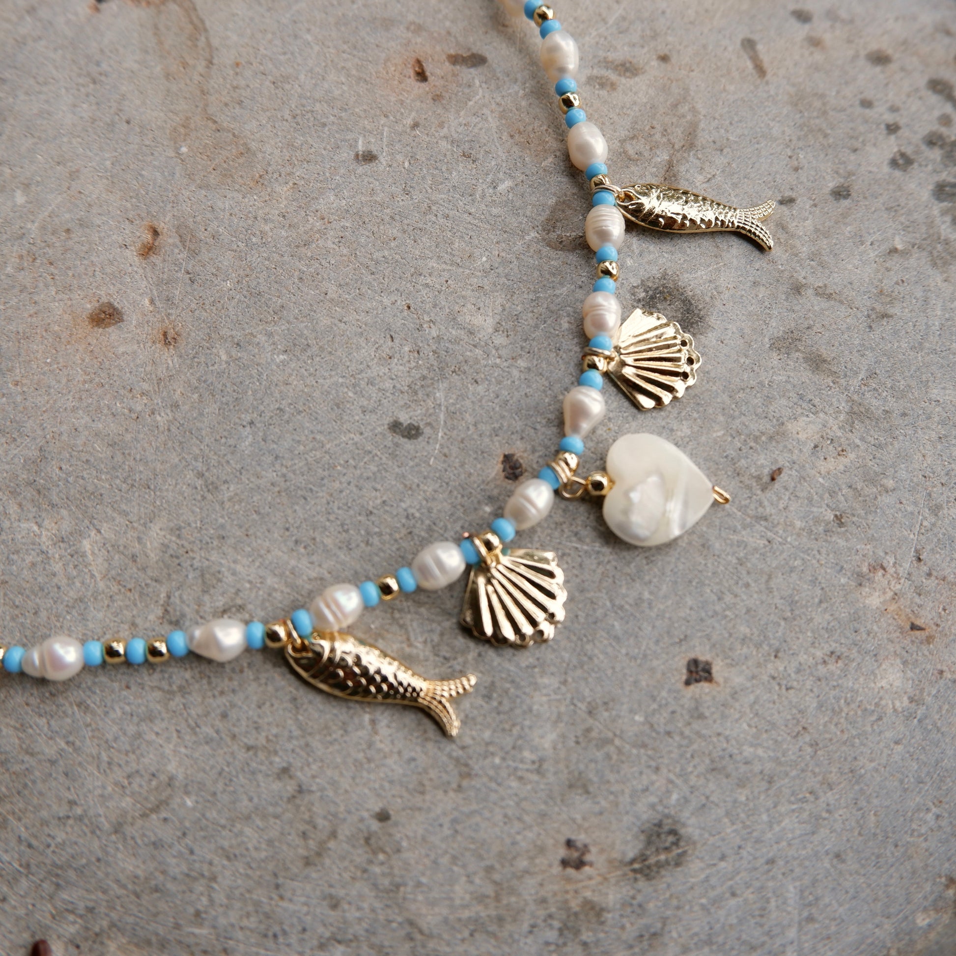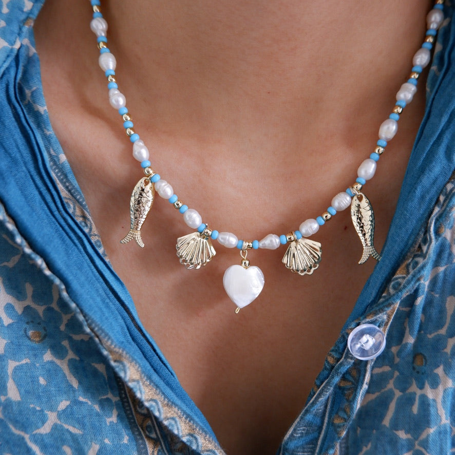 The vibrant mix of blue accents with golden and pearly elements evokes the feeling of a day spent by the beach. Perfect for summer outings or to bring a nautical touch to any look, this necklace adds a playful and elegant flair, making it ideal for lovers of the ocean and coastal vibes.