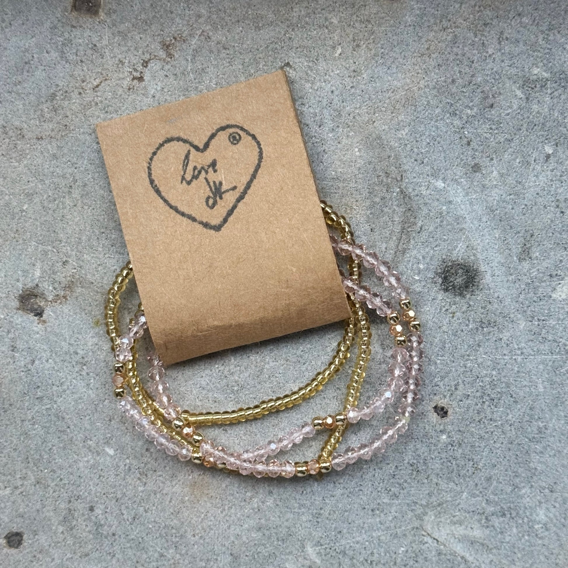 A mix of soft pink crystals and shiny gold beads, these bracelets add an elegant sparkle to any look. Lightweight and perfect for stacking, they bring a sophisticated yet playful touch to your style.