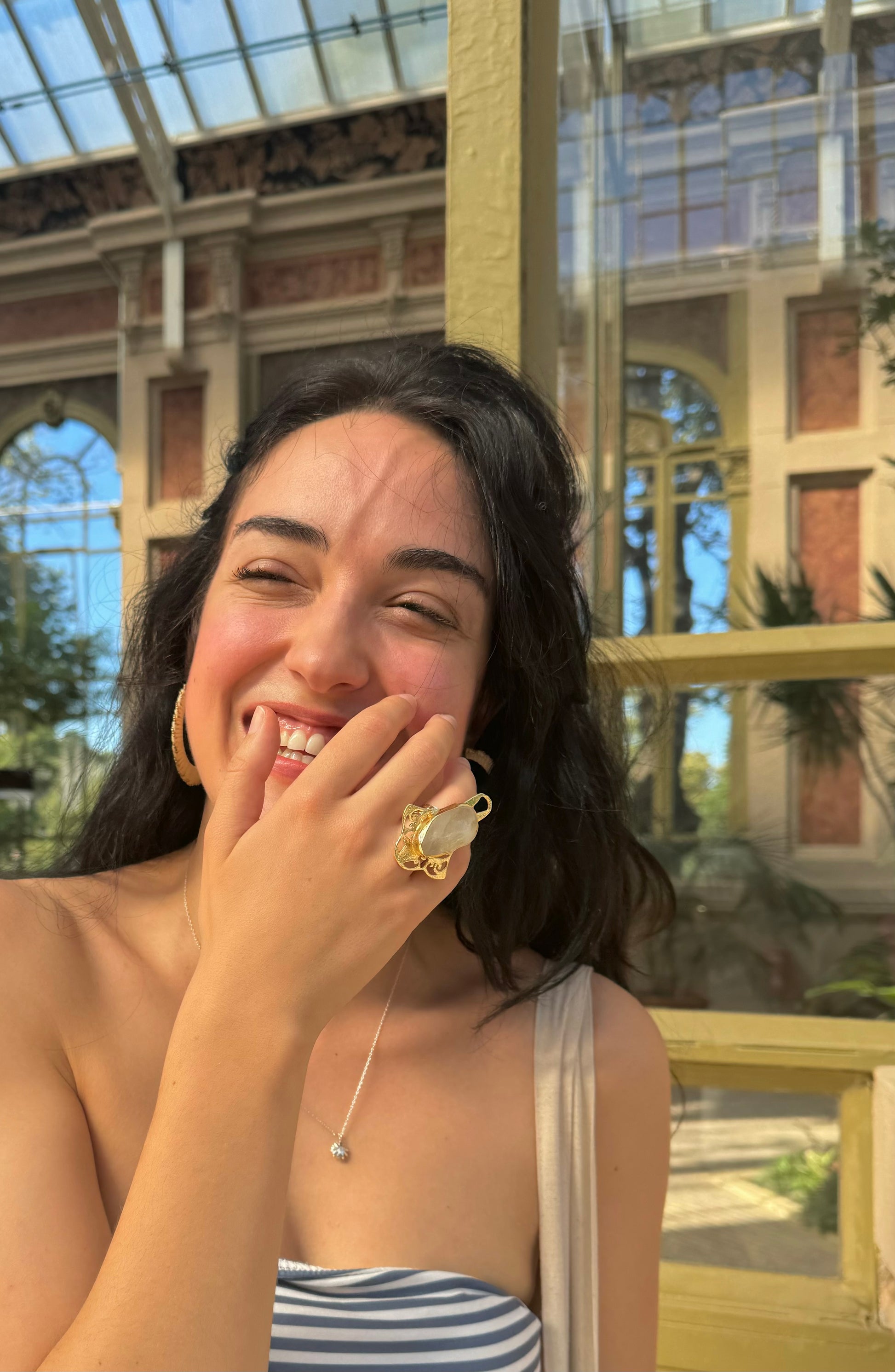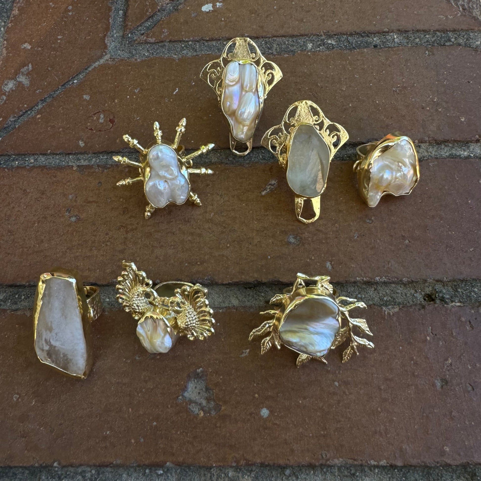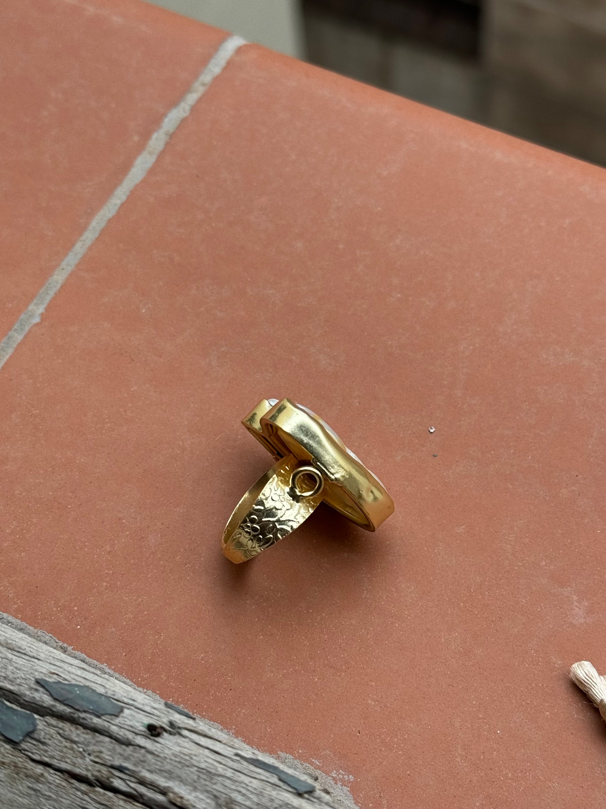 This exquisite Mother of Pearl Ring is crafted with a stunning brass setting that perfectly complements the iridescent beauty of the pearl. The adjustable band ensures a comfortable fit for any finger, offering both elegance and versatility. Ideal for both everyday wear and special occasions, this ring adds a touch of sophistication and natural charm to your ensemble.
