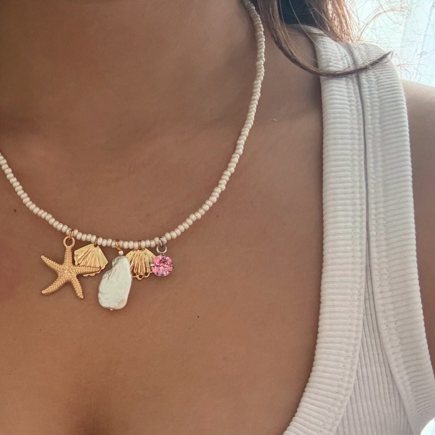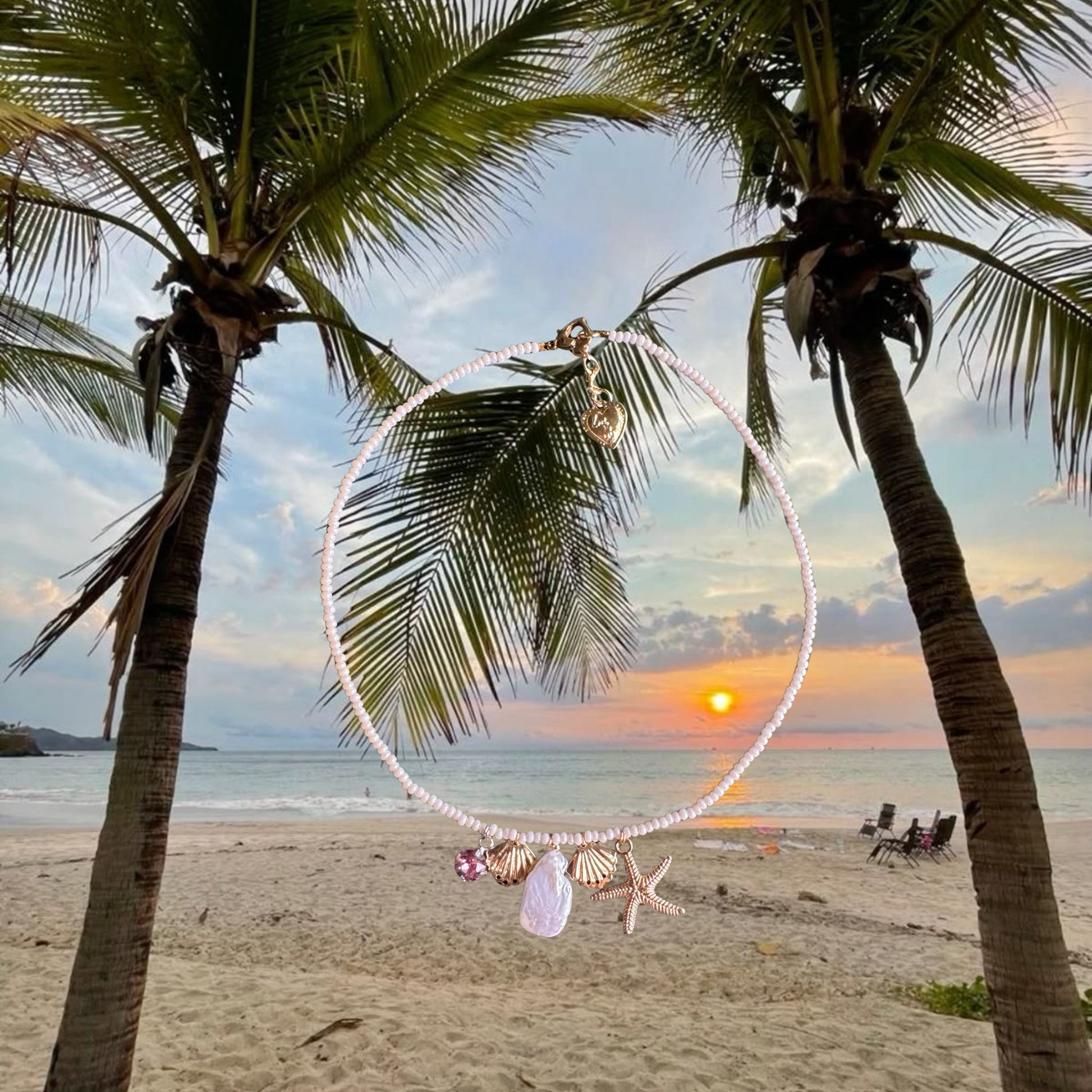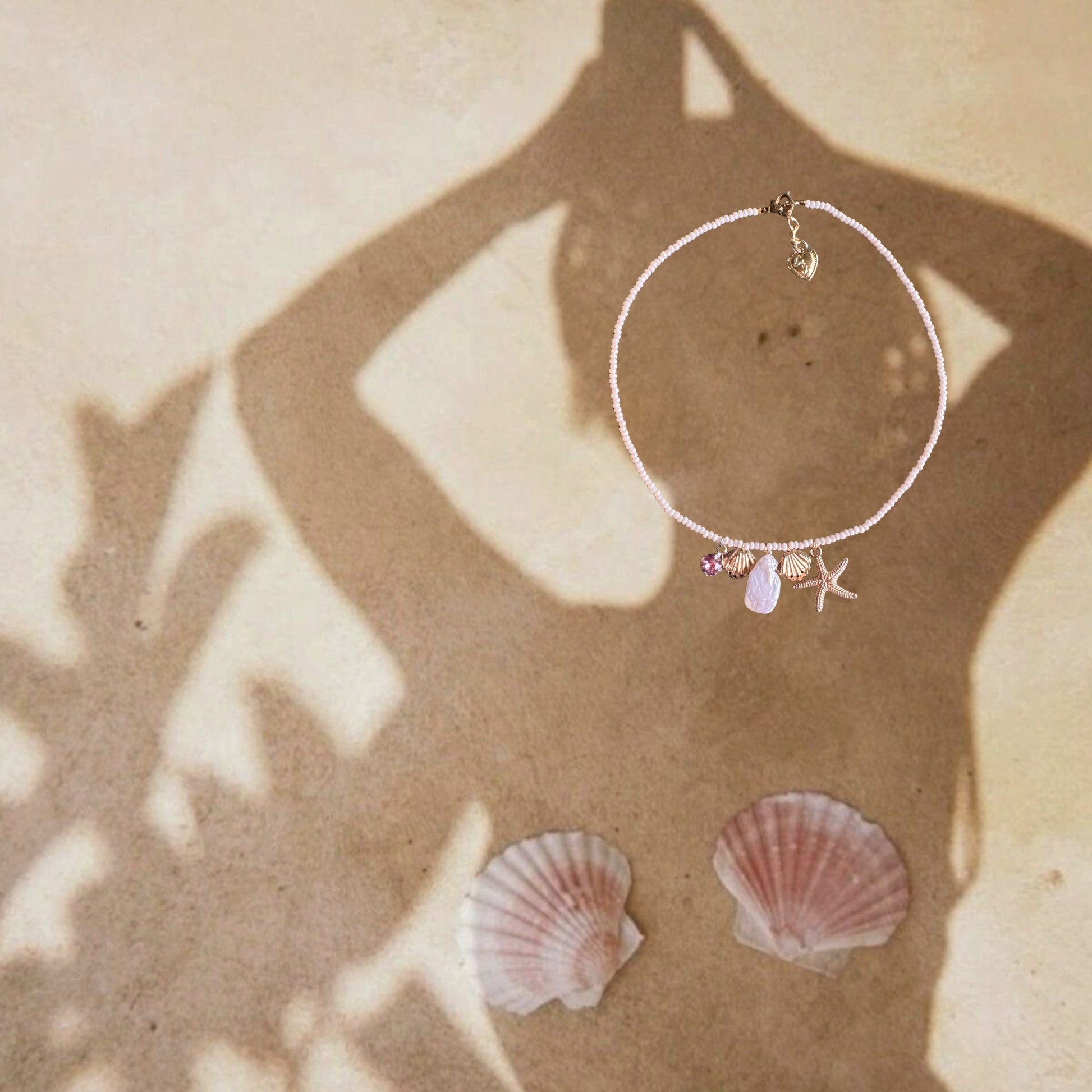 Crafted with delicate white Jeco glass beads, a Mother of Pearl centerpiece, and pink Swarovski crystal, it’s finished with a gold-plated heart lock — your secret love note to the sea.