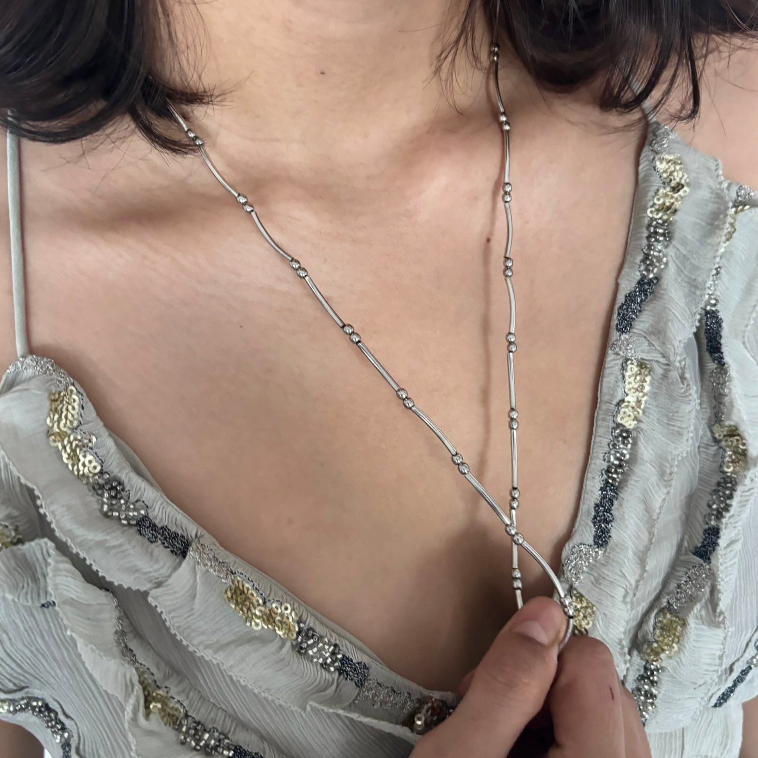 A fluid 29-inch silver-toned necklace designed to be worn long or double-layered for a versatile, everyday look. Featuring fine elongated links and subtle bead detailing, the silhouette feels light, minimal, and effortless.
