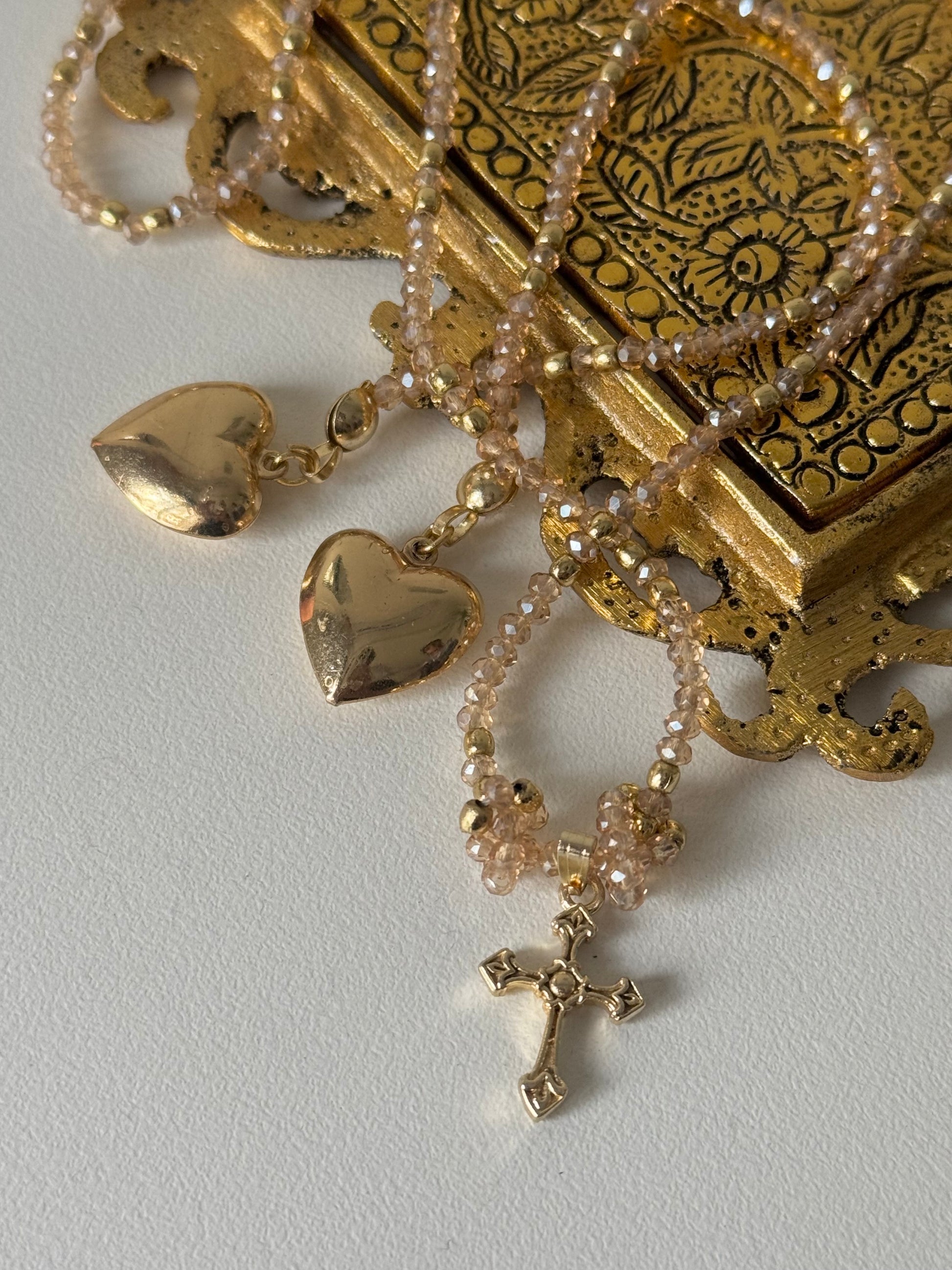 This no-clasp, all-fun beaded strand can be wrapped, looped, tied, or layered however you like — choker, lariat, body chain, or even a waist charm (yes, really). Featuring soft champagne beads, heart charms, and a tiny cross, it moves with your mood and lets you style without limits.