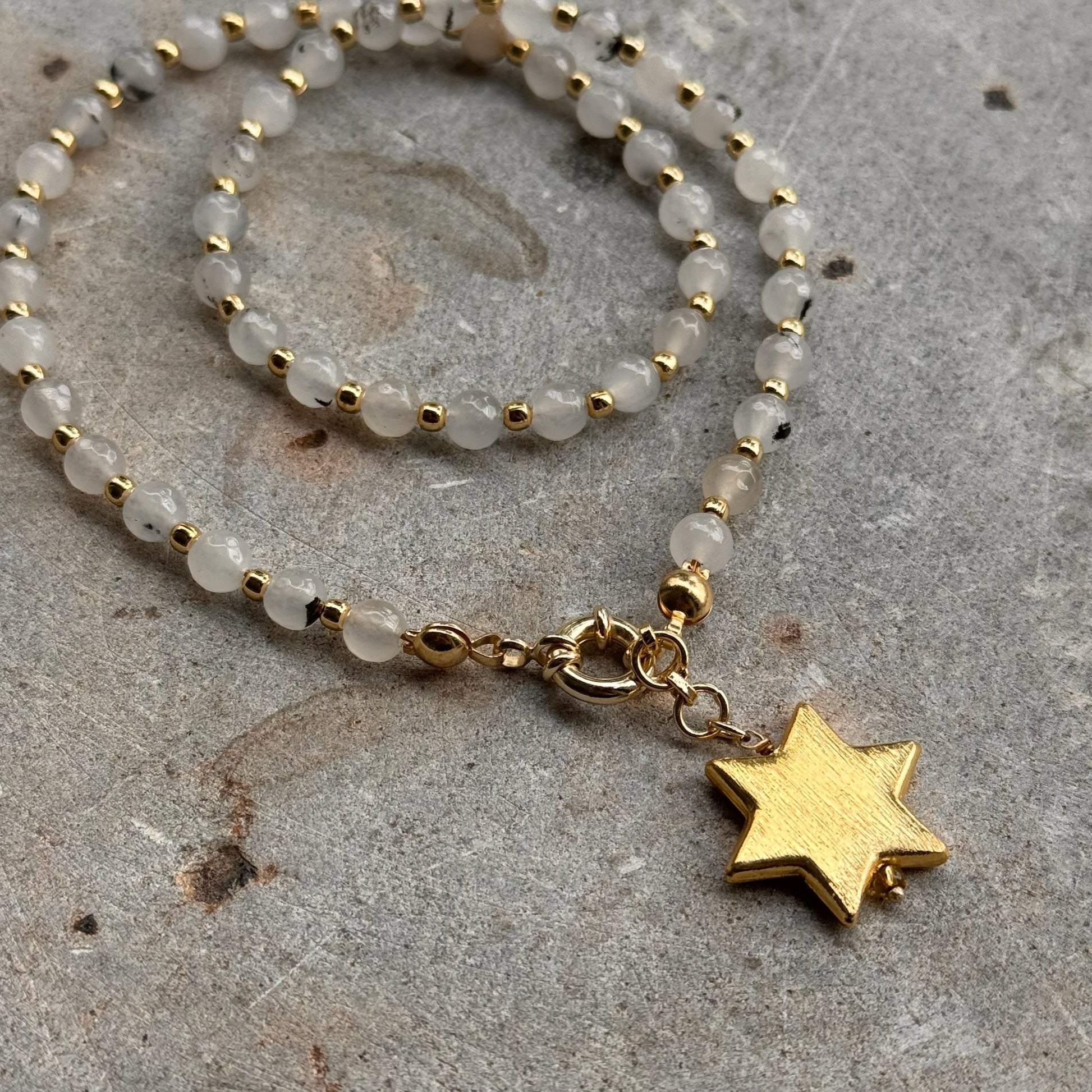 Featuring delicate white jade beads, this set includes a bracelet and a matching necklace, each adorned with a radiant golden star charm.